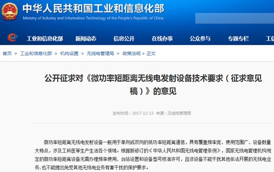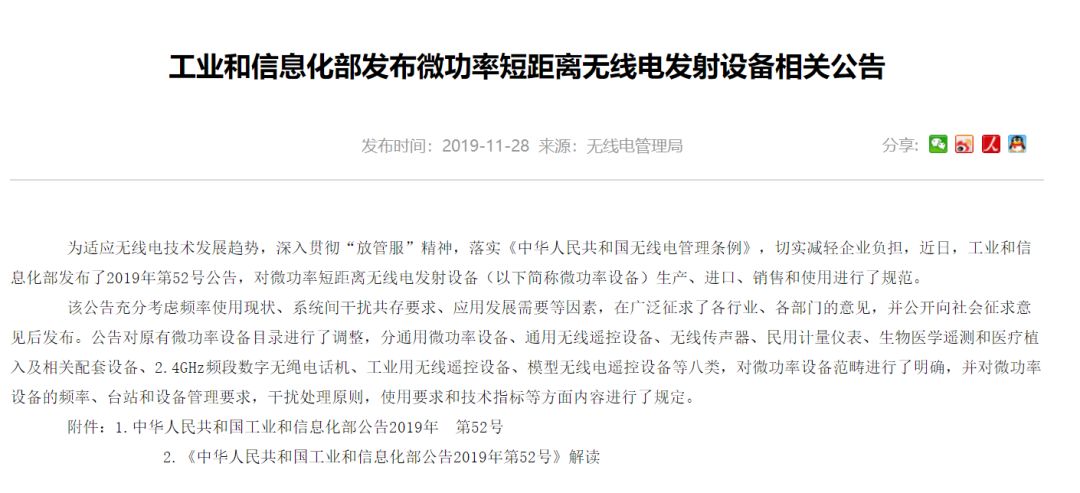 昨日,工信部官方网站和微信公众号公开发布了《微功率短距离无线电发射设备相关公告》(2019年52号公告),从2017年12月至今近2年时间,针对微功率设备监管制度的靴子终于落地。本文将从4个方面对此进行解读。