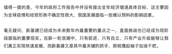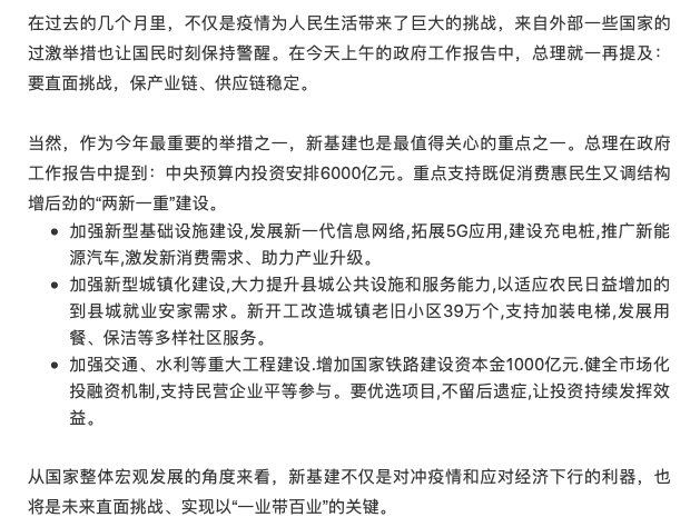 刚刚,政府工作报告提“两新一重”,点名5G,新基建列首,科技大佬纷纷建言献策来源:物联网智库 导 读 总理在政府工作报告中提到:中央预算内投资安排6000亿元。重点支持既促消费惠民生又调结构增后劲的“两新一重”建设。